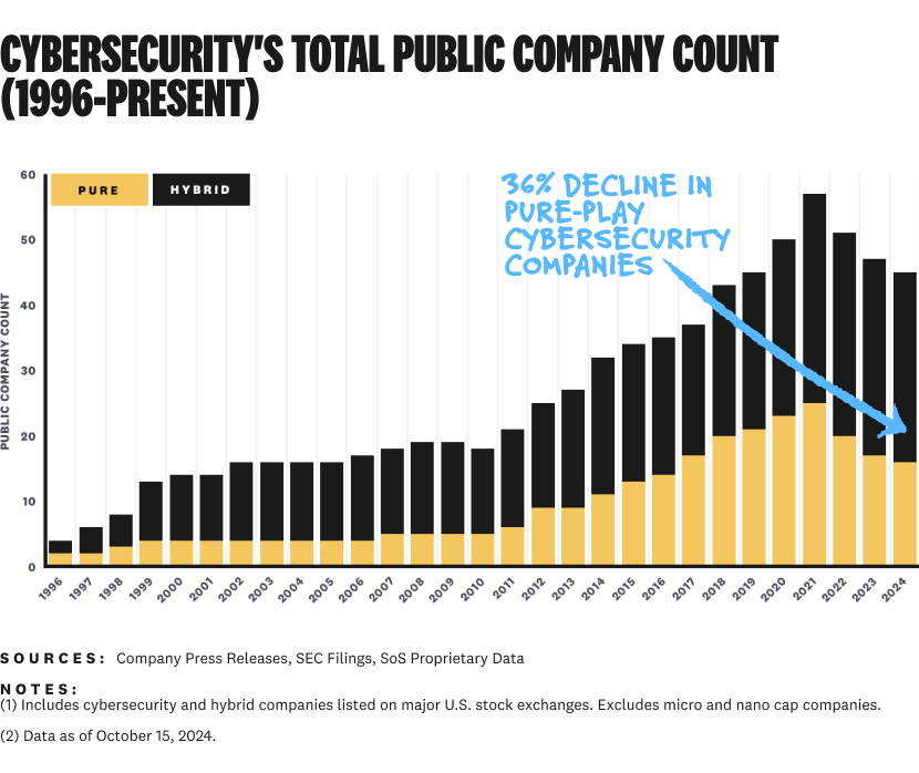 Cybersecurity companies are going private at a shocking rate. We've lost 12 public companies since 2022, including nine pure-play cybersecurity companies.¹