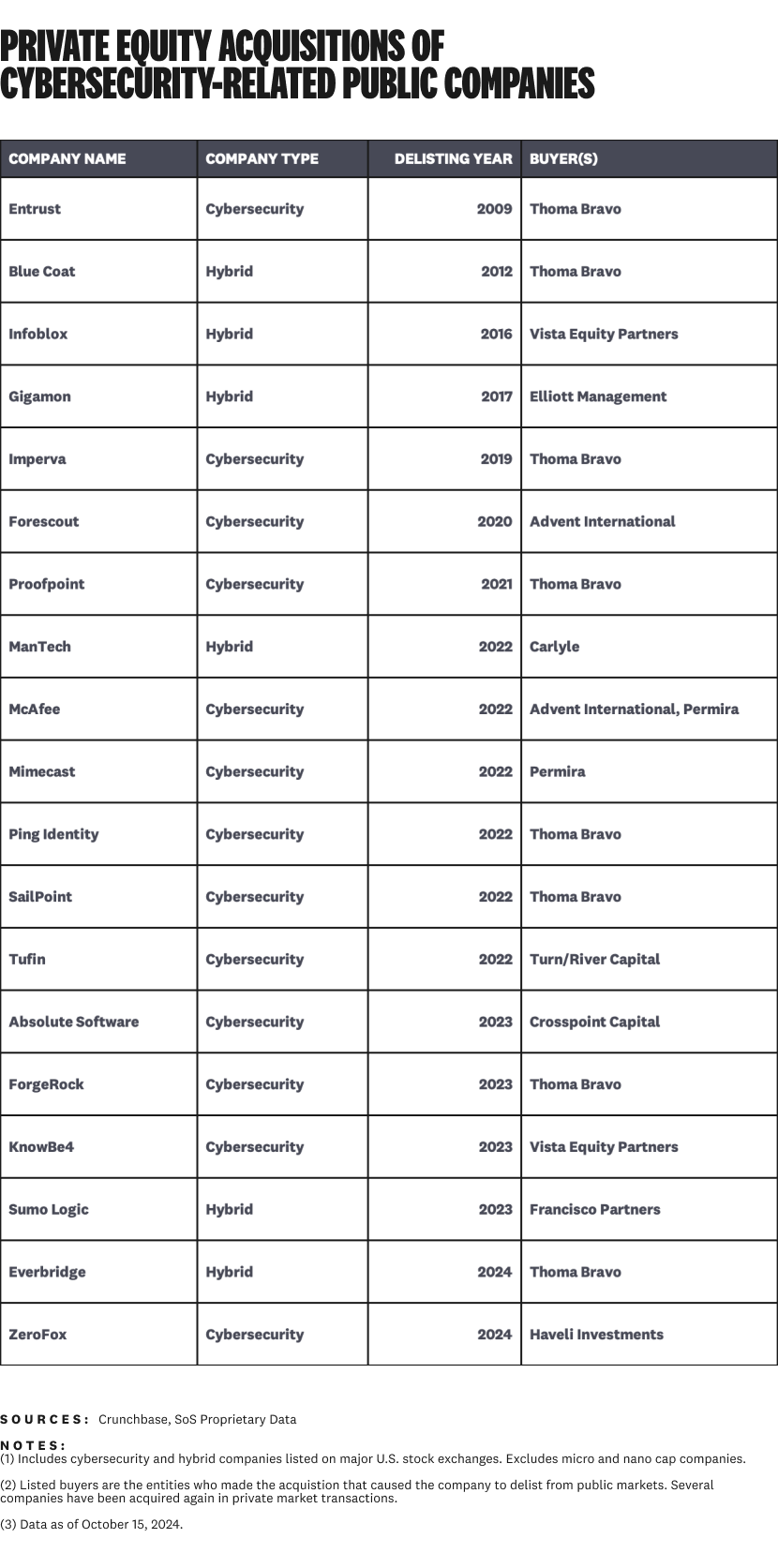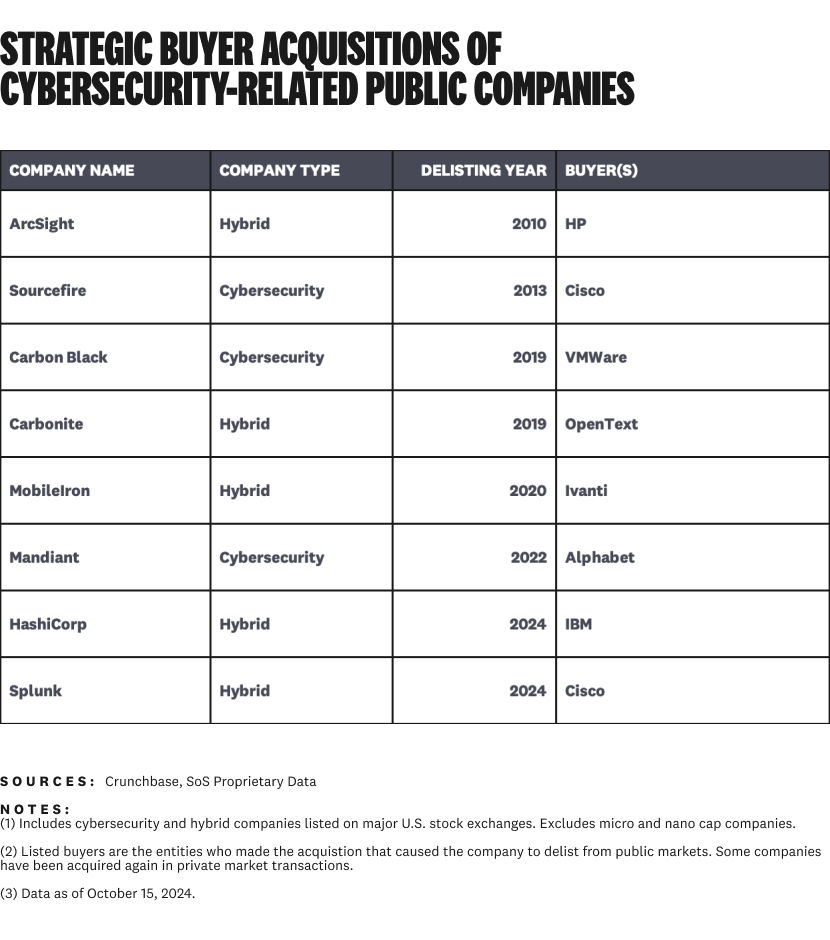Historically, cybersecurity-related companies leave the public markets in one of two ways: an acquisition by a private equity firm, or an acquisition by a strategic acquirer.