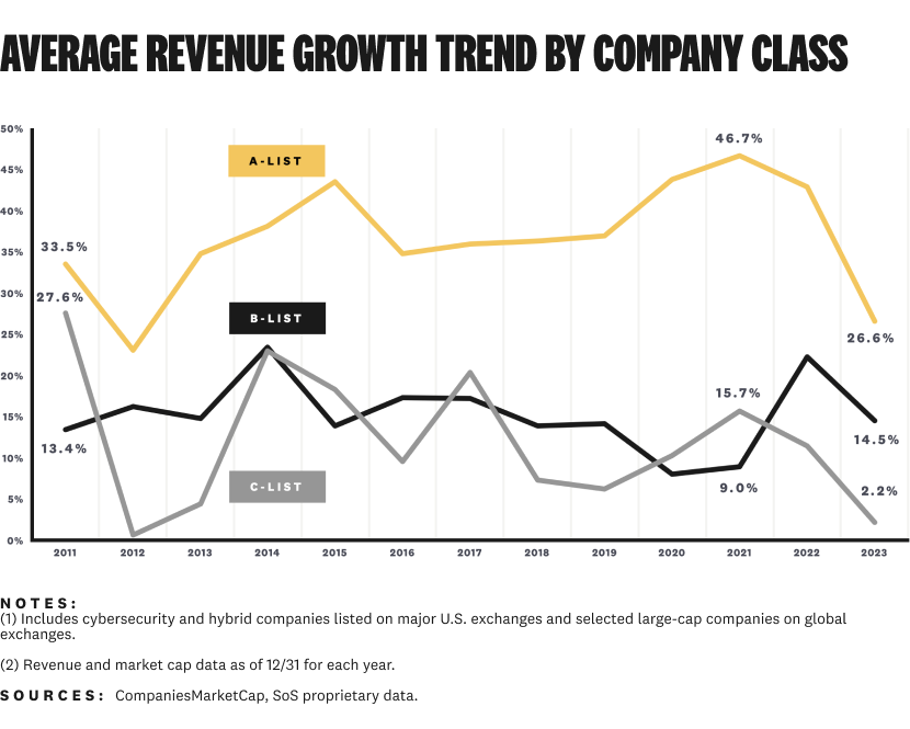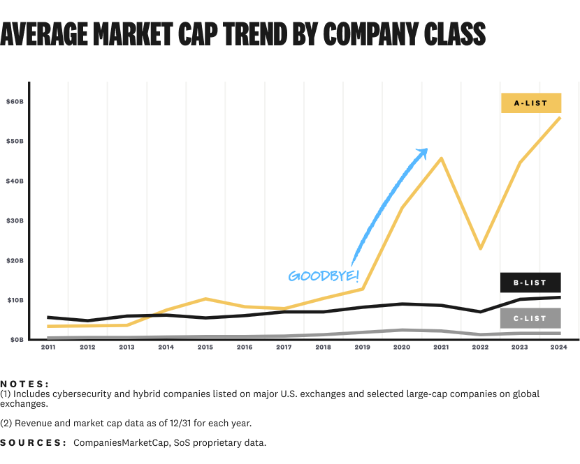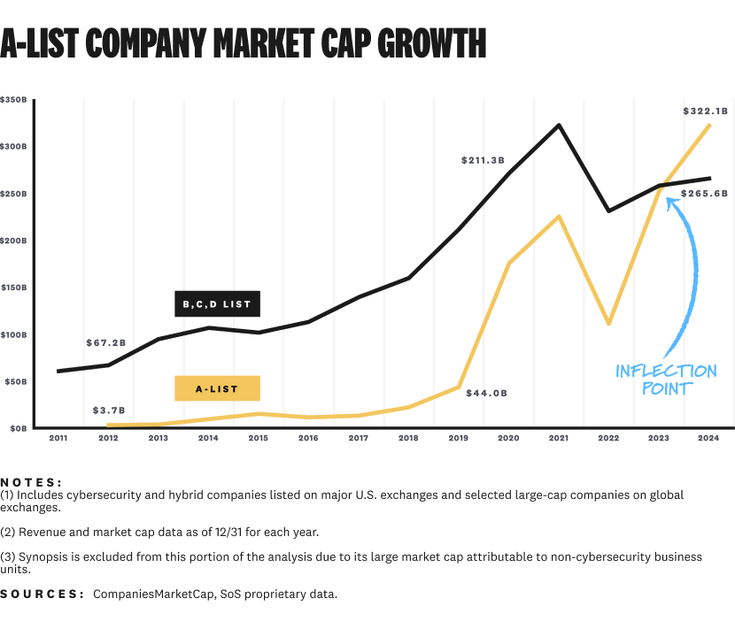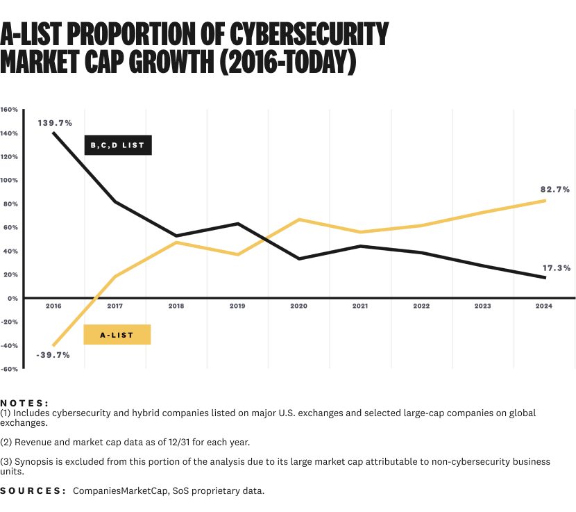 Today's A-list companies were almost non-existent a decade ago. Only Fortinet and Palo Alto Networks were public in 2014. Now, the seven A-list companies are worth more than every other public company in the industry.