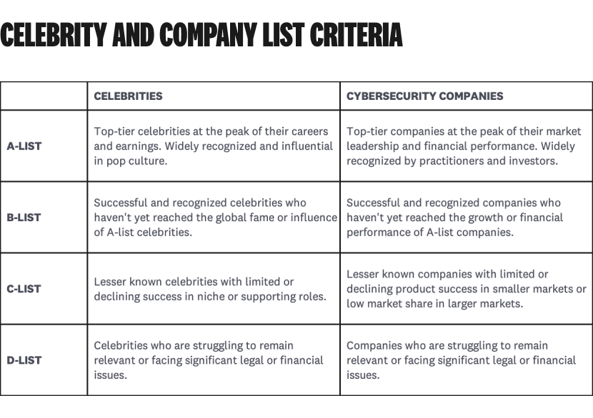 So, let's go with it. Enough suspense already — let's reveal cybersecurity's A-list companies.