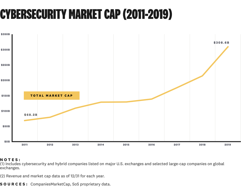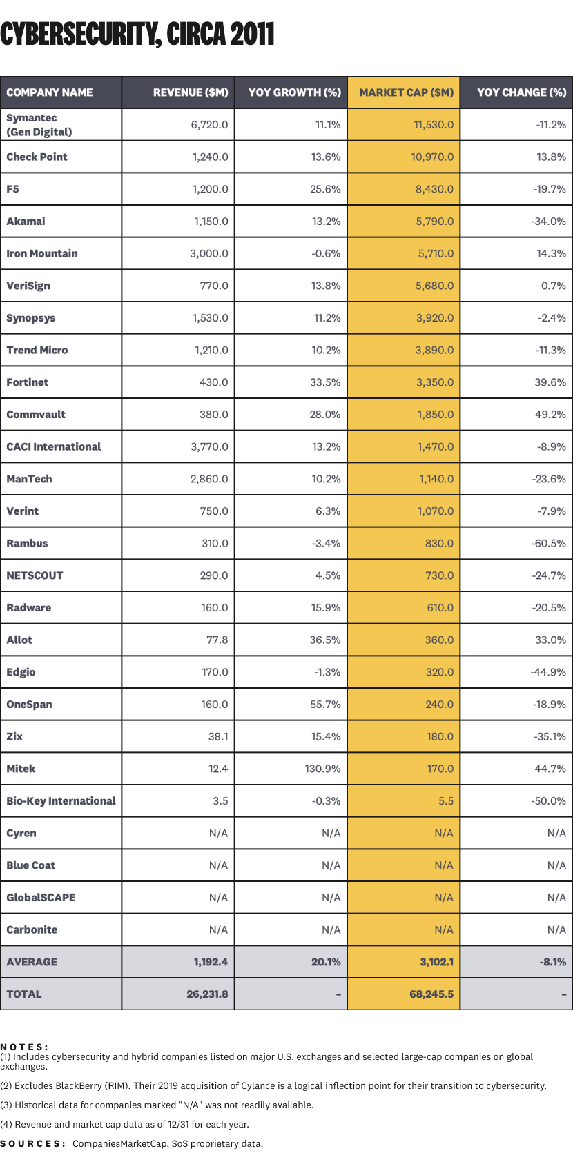 The cybersecurity industry of 2011 feels pretty unfamiliar, too.⁴ Breaches of Epsilon, RSA, and the Sony PlayStation Network were the major events of the year. Back then, we had 26 public companies with a total market cap of $68.2 billion:
