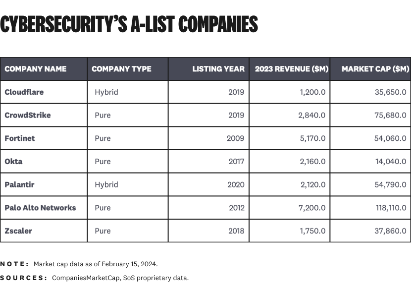 Cybersecurity's seven A-list companies currently have a higher market cap than the remaining 50 companies combined: