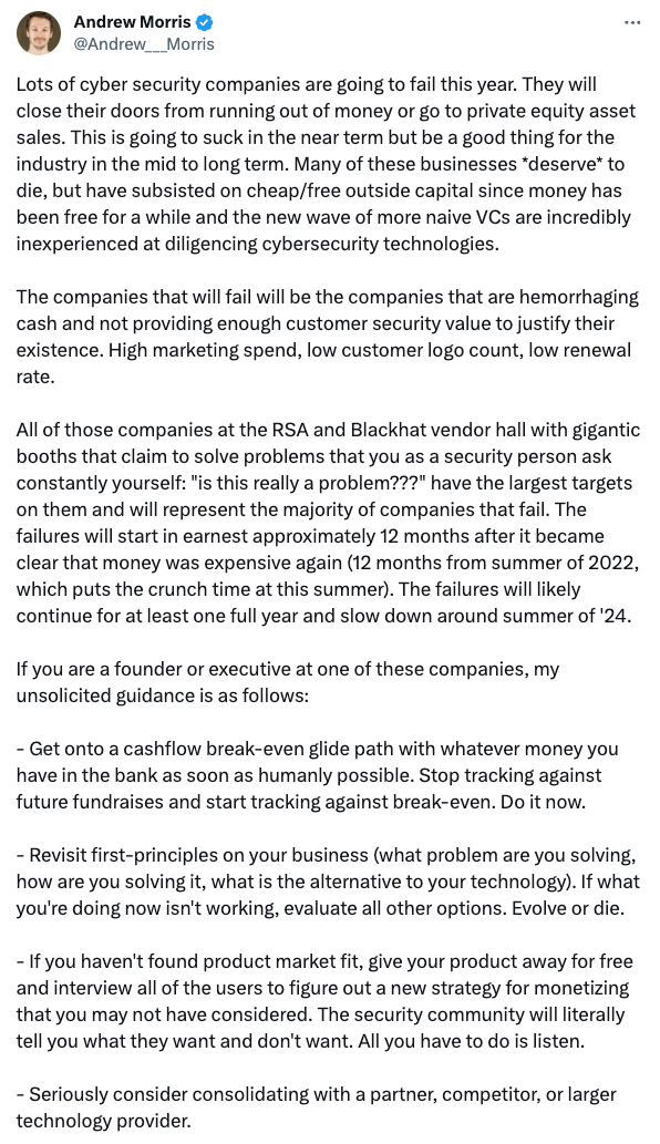 We’re past the point of "the market will come back" or "this will all blow over." There are too many cybersecurity companies with high valuations to exit under current (and near-term) market conditions. I know, what a party foul.