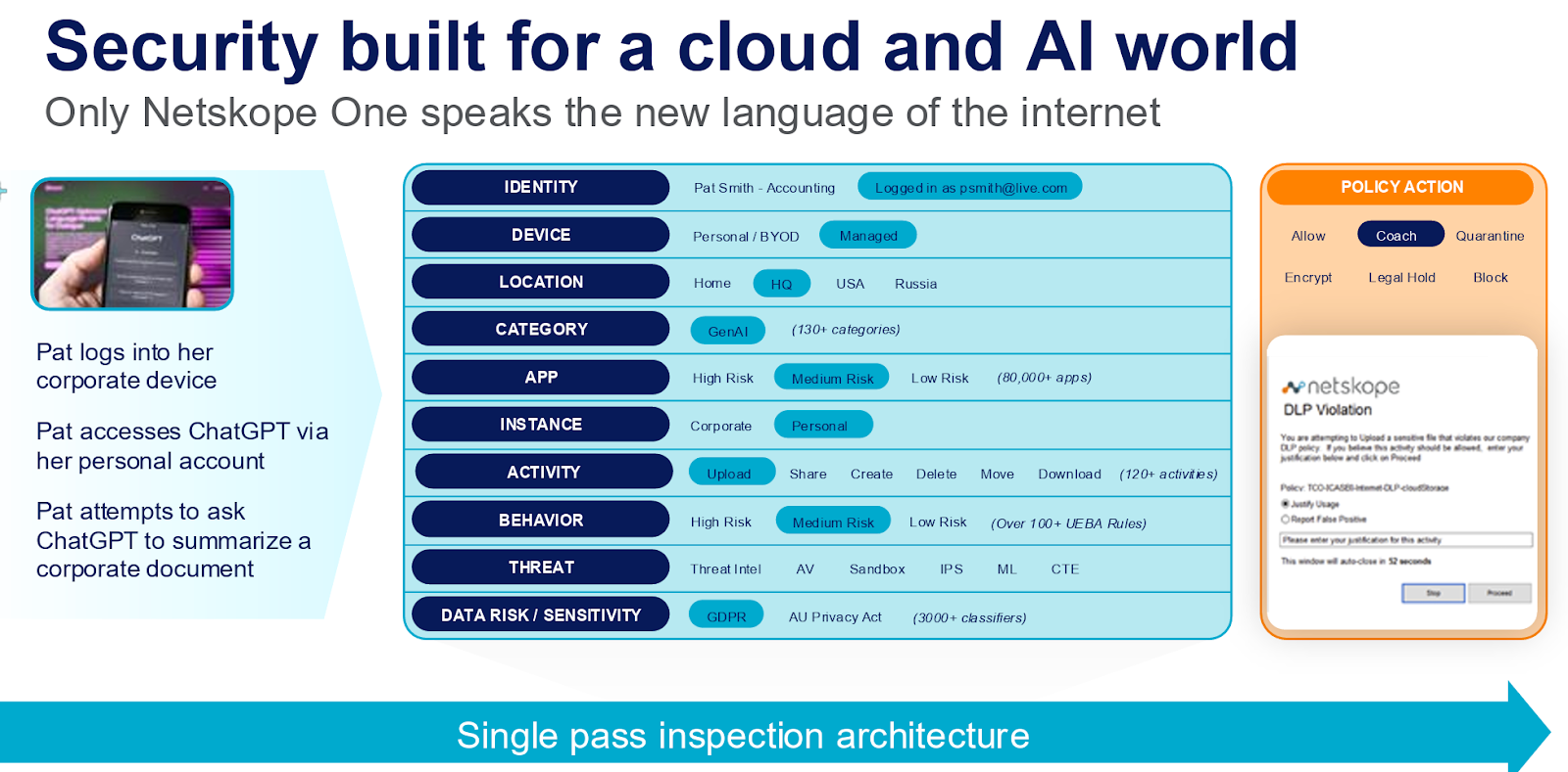 Netskope also extends DLP directly into generative AI workflows for monitoring prompts, preventing sensitive uploads into public models, and inspecting AI-generated outputs for inadvertent leakage. In practice, this means that employees cannot paste intellectual property into ChatGPT or accidentally exfiltrate regulated data through a Copilot response without Netskope detecting and enforcing policy. The company’s framing of this as “secure enablement of AI” reflects its intent to make AI safe to use in enterprise rather than simply blocking it altogether.