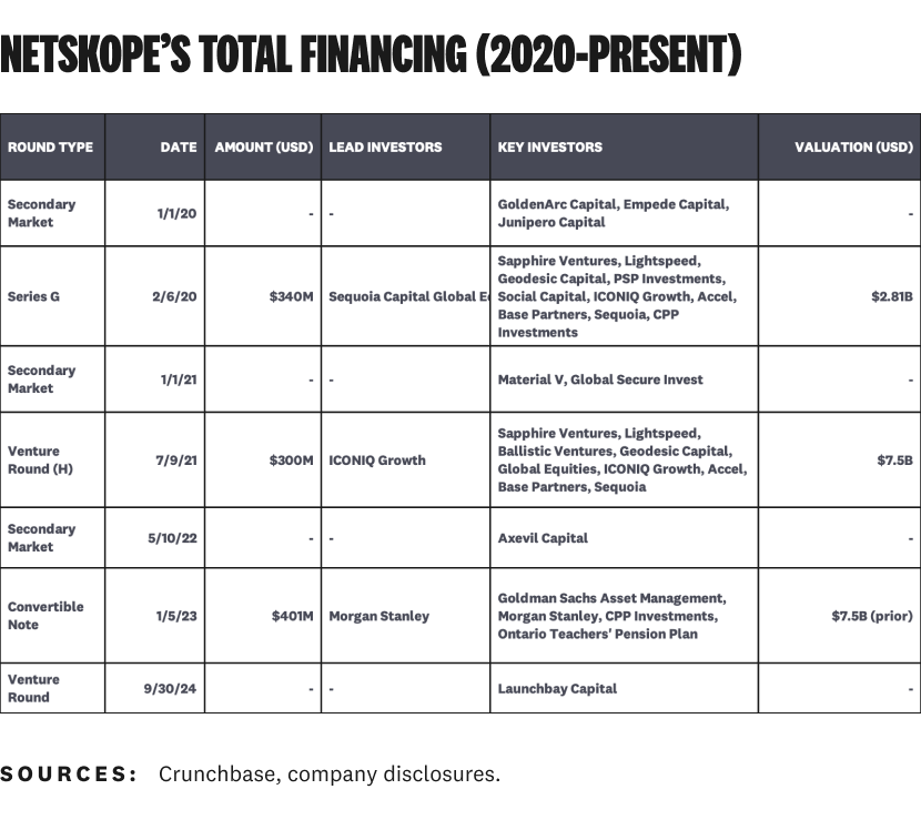 Netskope last raised money in 2021 at a $7.5B valuation. They’ve pulled in $1.4B total from a deep bench of crossover names: ICONIQ, Lightspeed, Accel, Sequoia, and SoftBank.