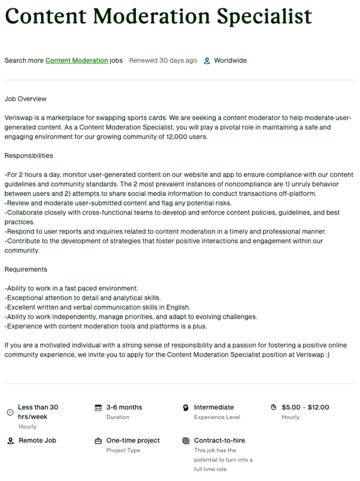 Content moderation jobs meet all the criteria of jobs that should be automated. Here's a real example of a job posting from Upwork: